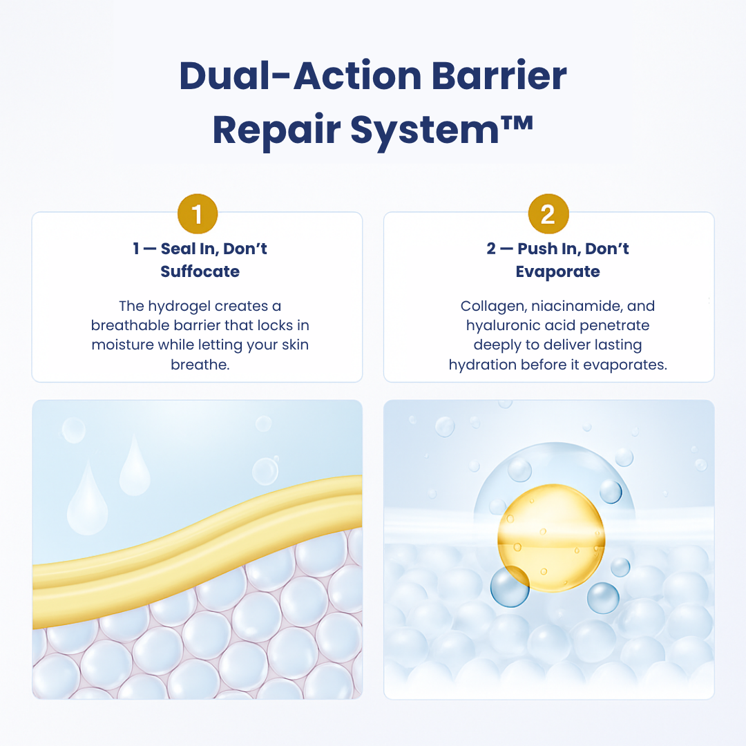 2. Entrega profunda : mientras están sellados, el colágeno, la niacinamida y los ácidos hialurónicos penetran 5 veces más profundamente para lograr una tersura y reparación visibles.